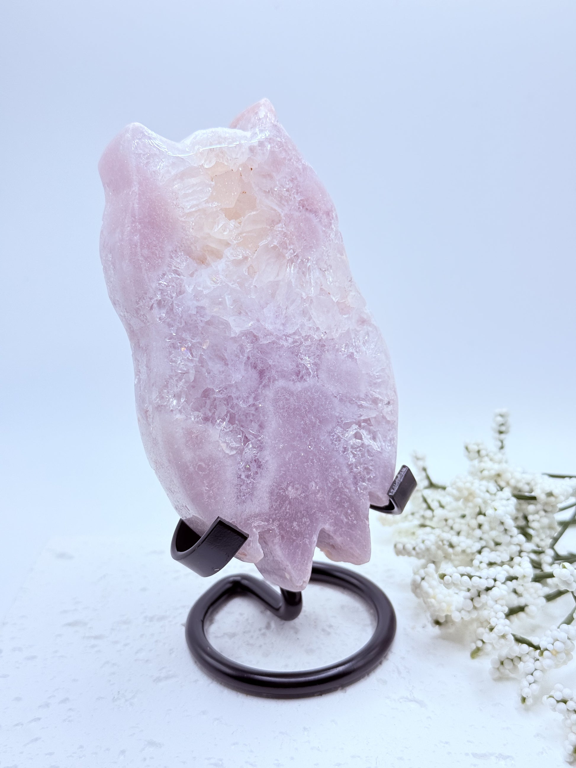 Amethyst Druzy Owl Carving showcases rich purple tones with shimmering druzy crystal accents, beautifully carved into the form of an owl, a symbol of wisdom, protection, and intuition. Amethyst is renowned for its calming and spiritual properties, helping to relieve stress, enhance clarity, and deepen meditation. The sparkling druzy enhances the energy flow, making this piece both visually stunning and energetically powerful. Perfect for display, healing spaces, or as a meaningful spiritual gift.