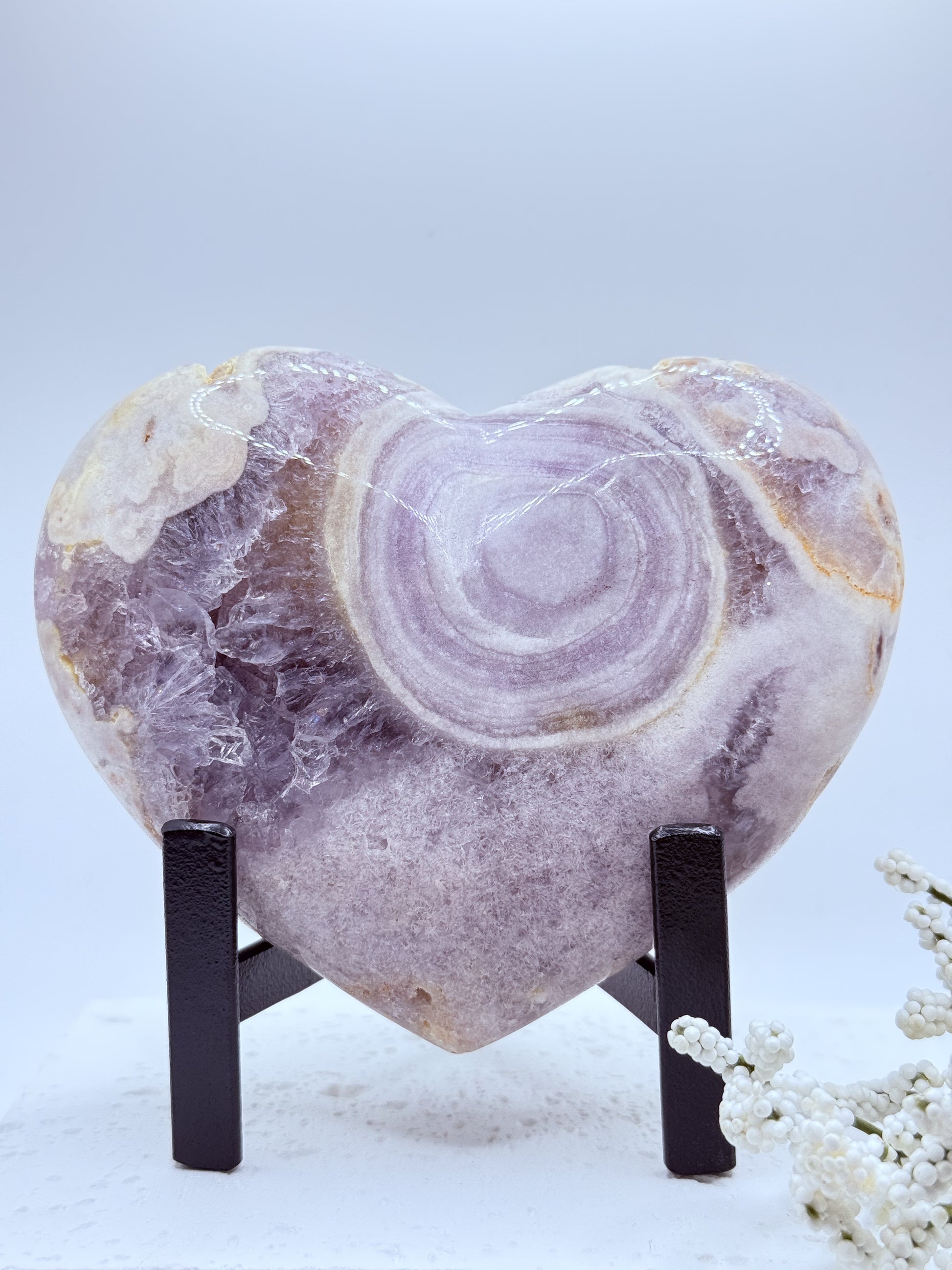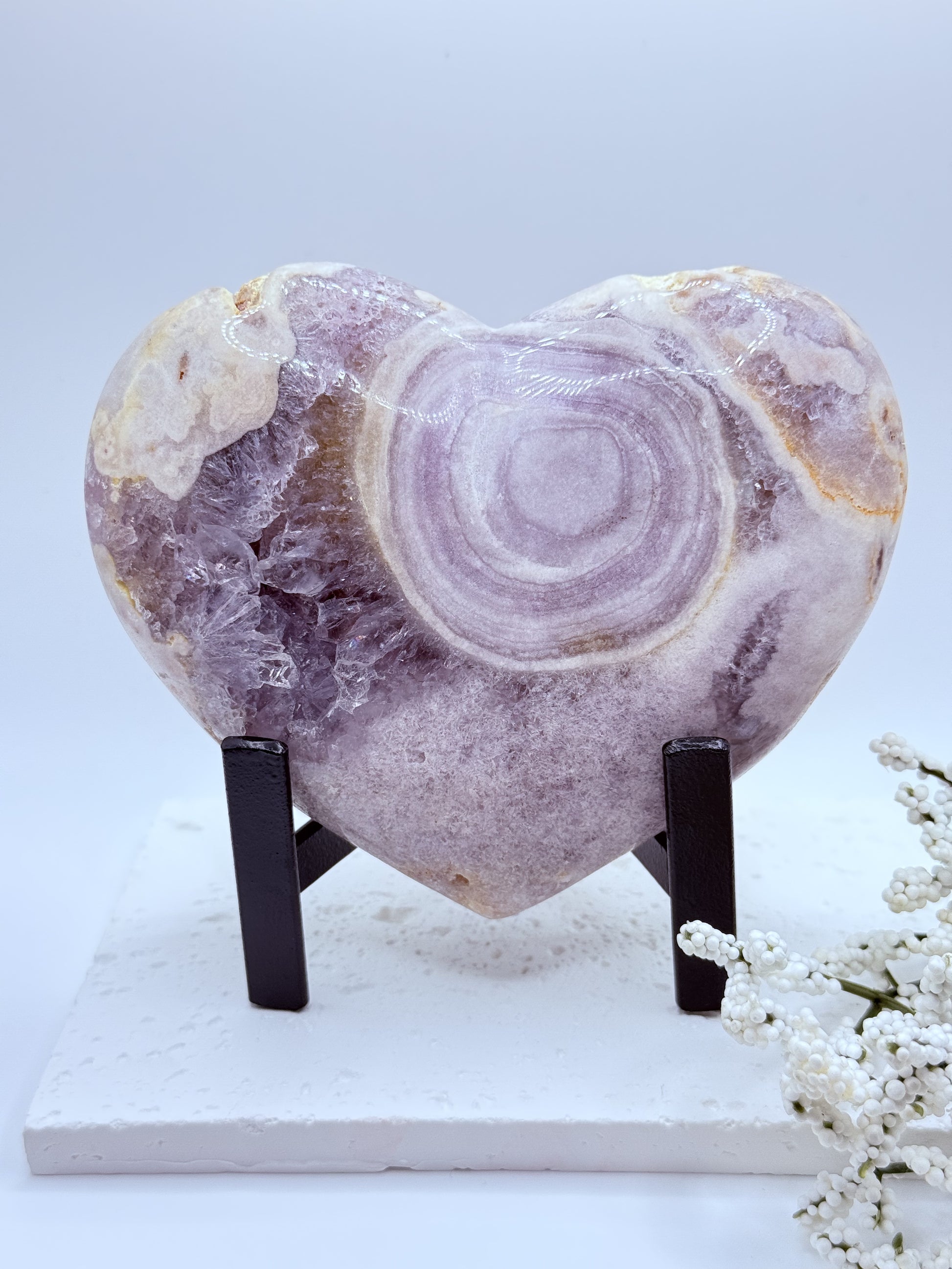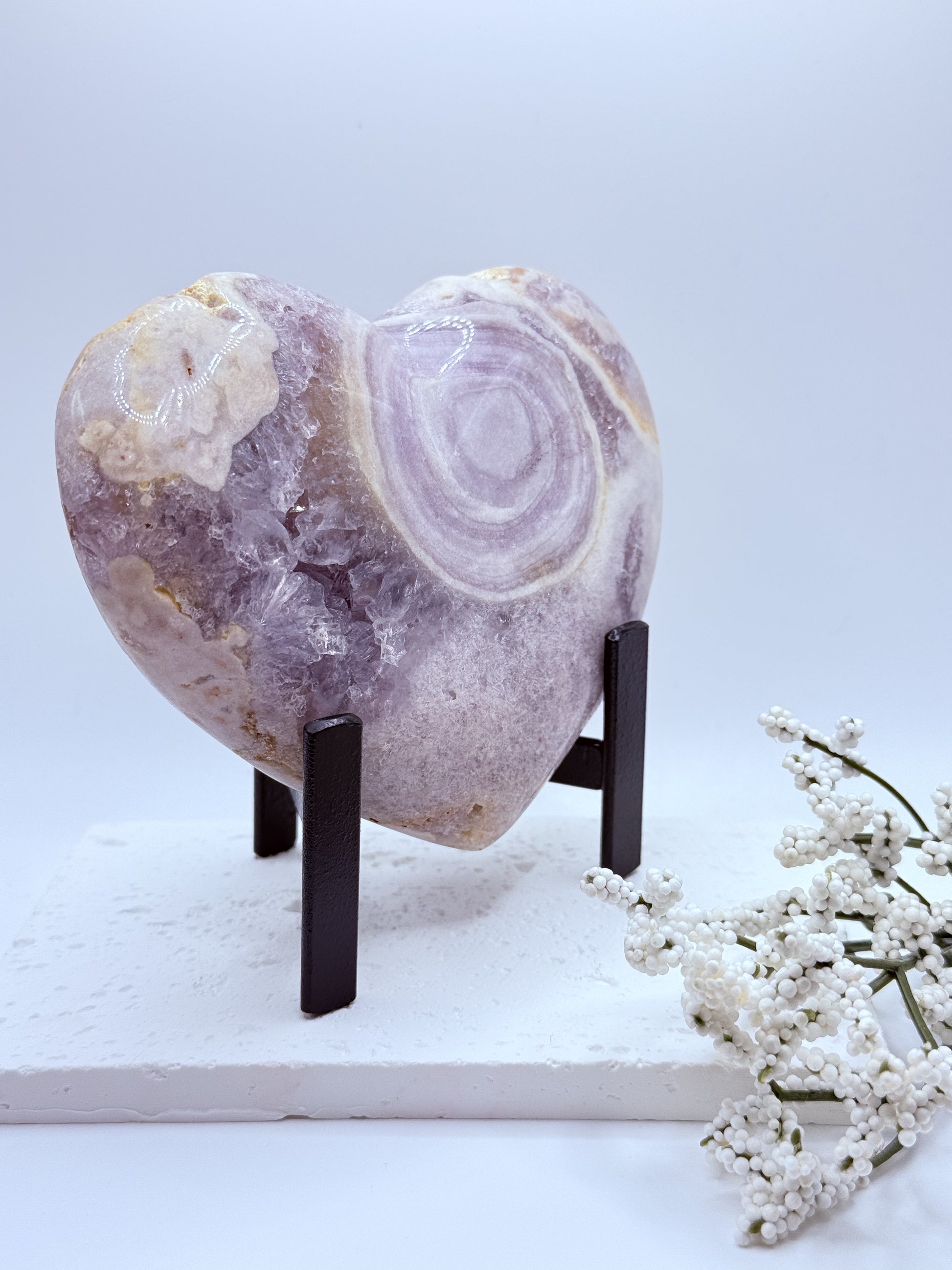 The Amethyst & Flower Agate Heart Carving beautifully blends the deep purple hues of Amethyst with the soft, floral patterns of Flower Agate, creating a unique and harmonious crystal piece. Amethyst is known for its calming, protective energy that promotes clarity and spiritual awareness, while Flower Agate supports personal growth, self-love, and emotional healing. Shaped as a heart, this carving symbolizes compassion and balance, deal for meditation, healing, or heartfelt décor.