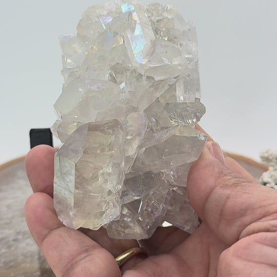 The clustered formation features multiple points that reflect light from every angle, while the aura coating introduces a soft, ethereal glow without overpowering the stone’s natural structure. The result is a piece that feels both contemporary and elemental—perfect for curated interiors or statement displays.