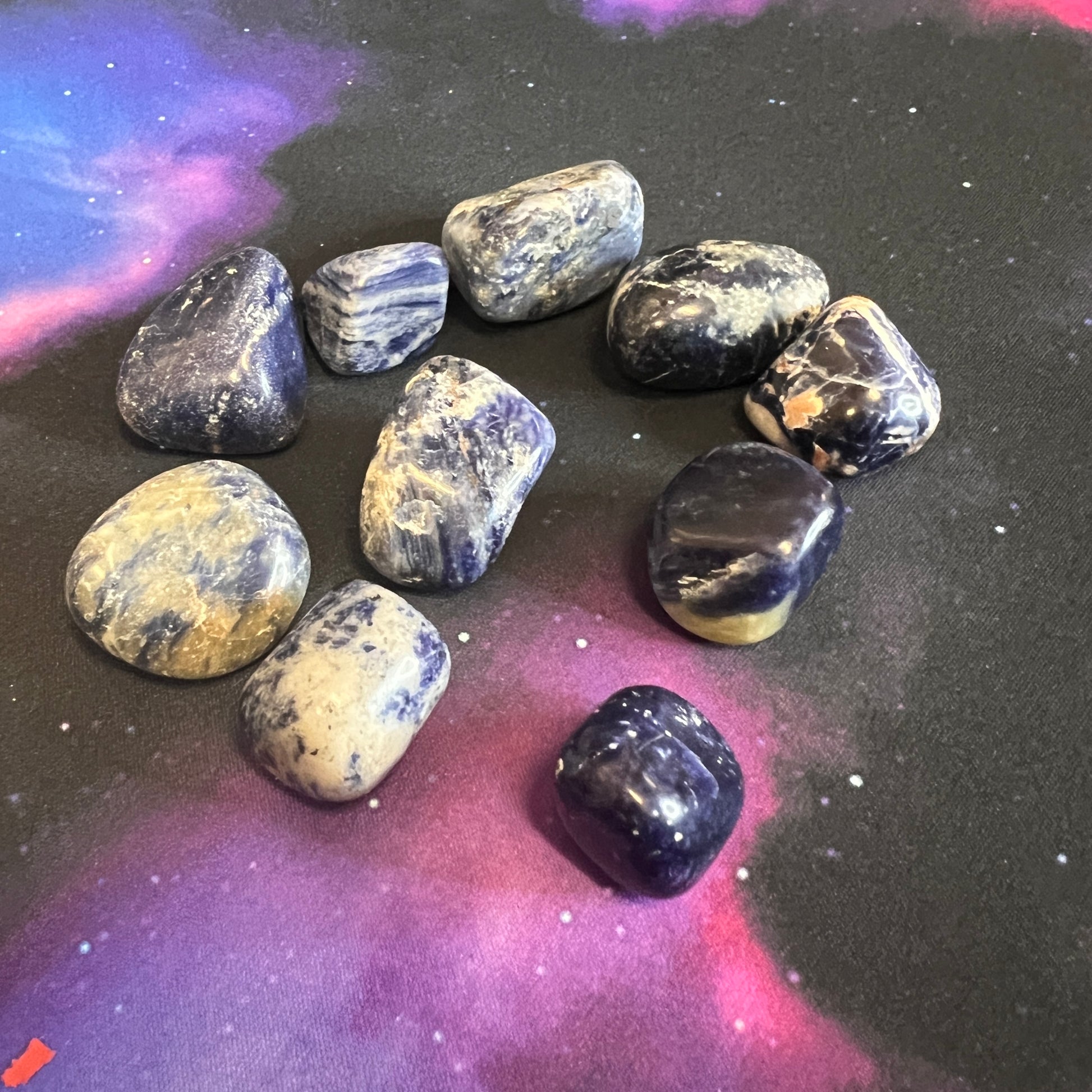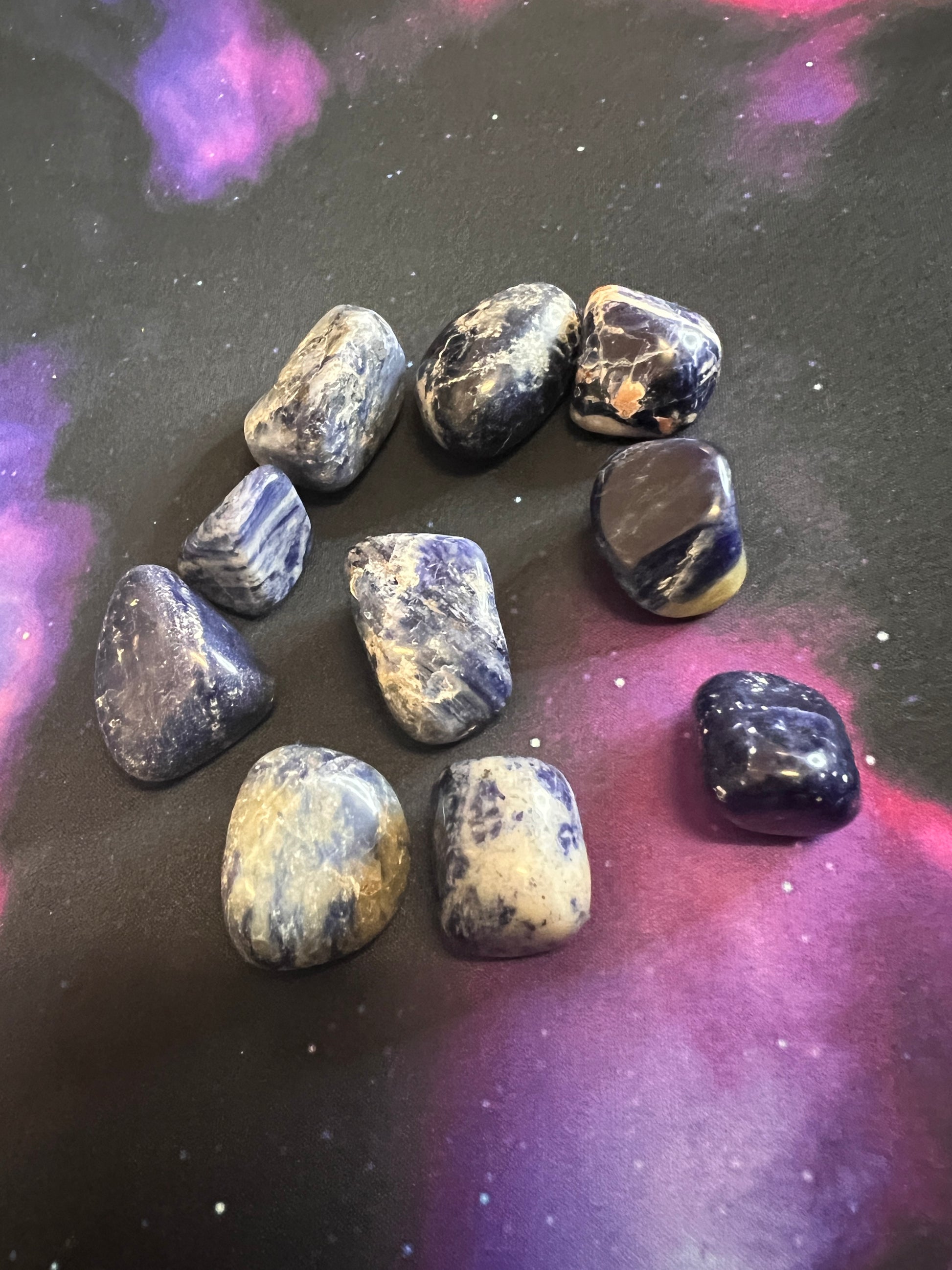 The Blue Sodalite Tumbles Set promotes clarity, truth, and inner peace. Their deep blue tones make them ideal for meditation, focus, or crystal grids.