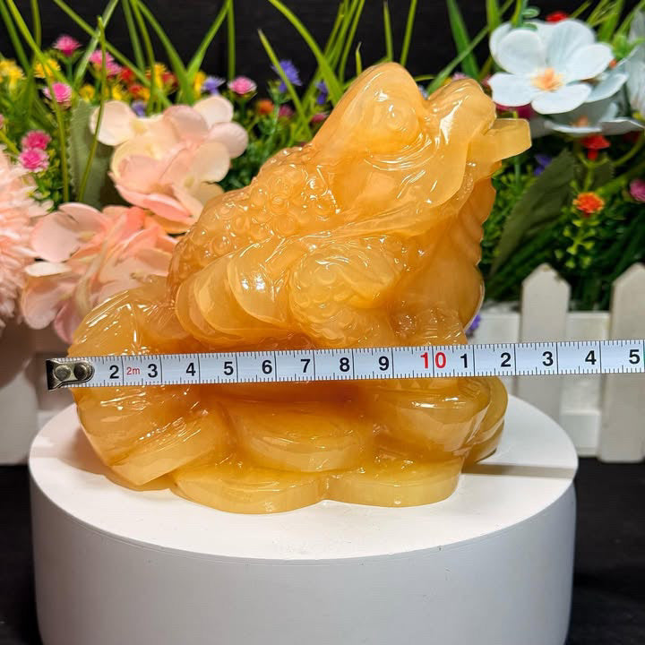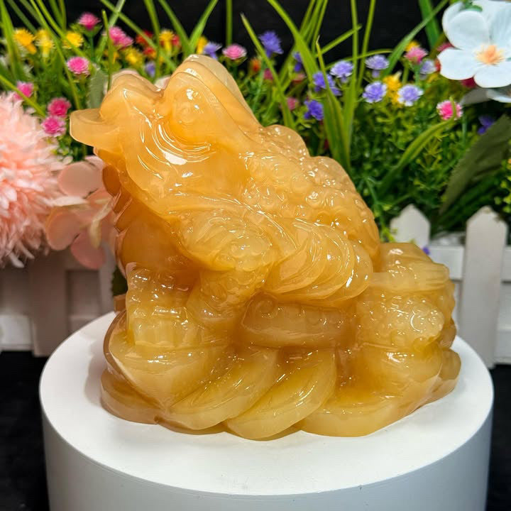 The Calcite Money Toad is a striking symbol of wealth and prosperity. Its warm tones and detailed carving make it a powerful and eye-catching good luck charm.