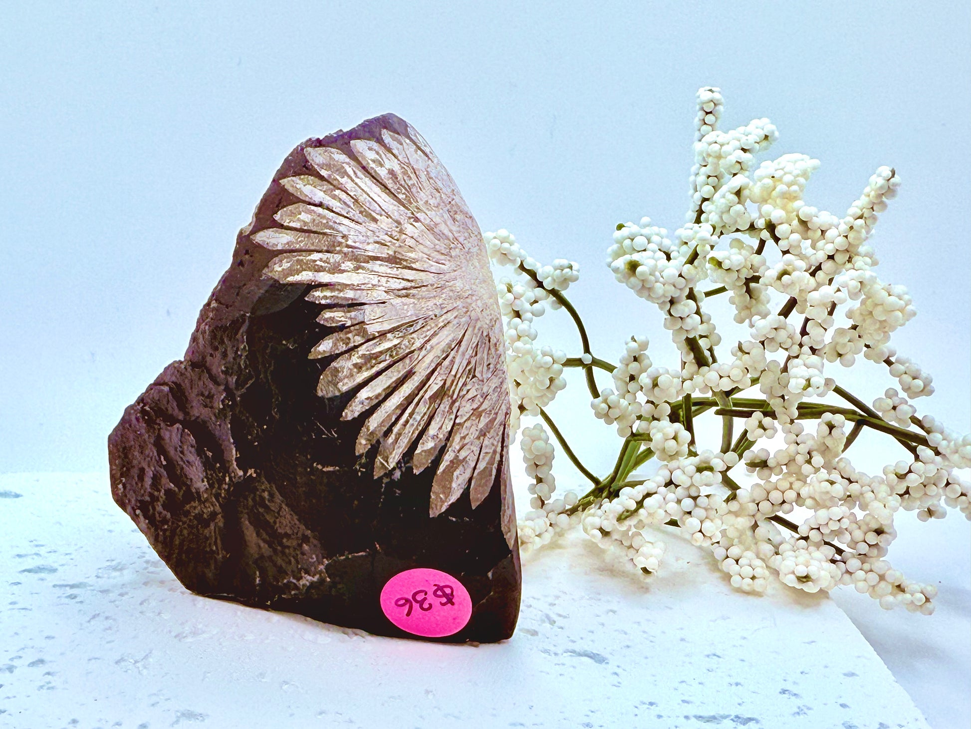 Raw chrysanthemum stone with vivid white petals on a dark base. Its rugged surface adds unique character to my collection, sparking curiosity about nature’s artistry.