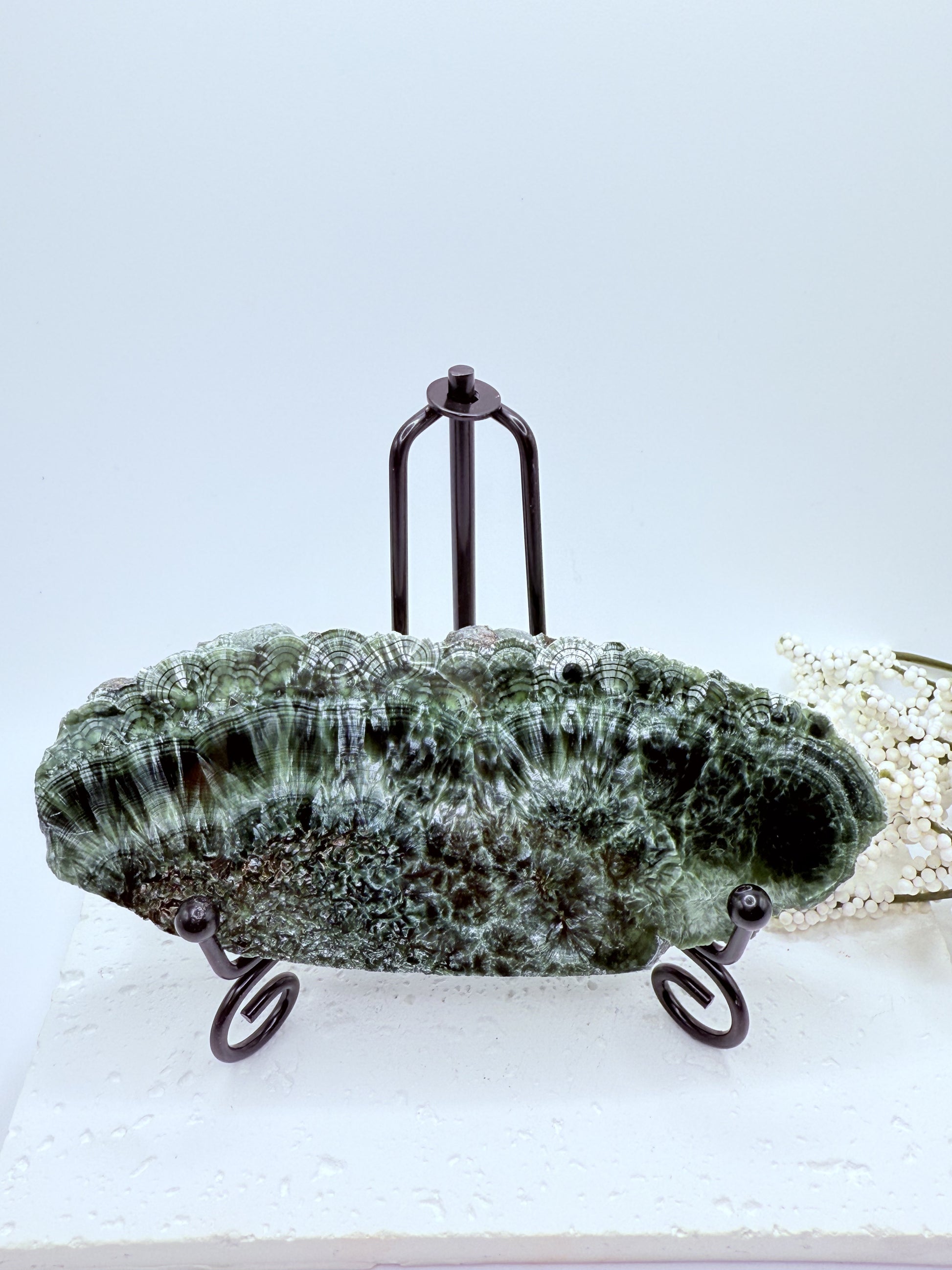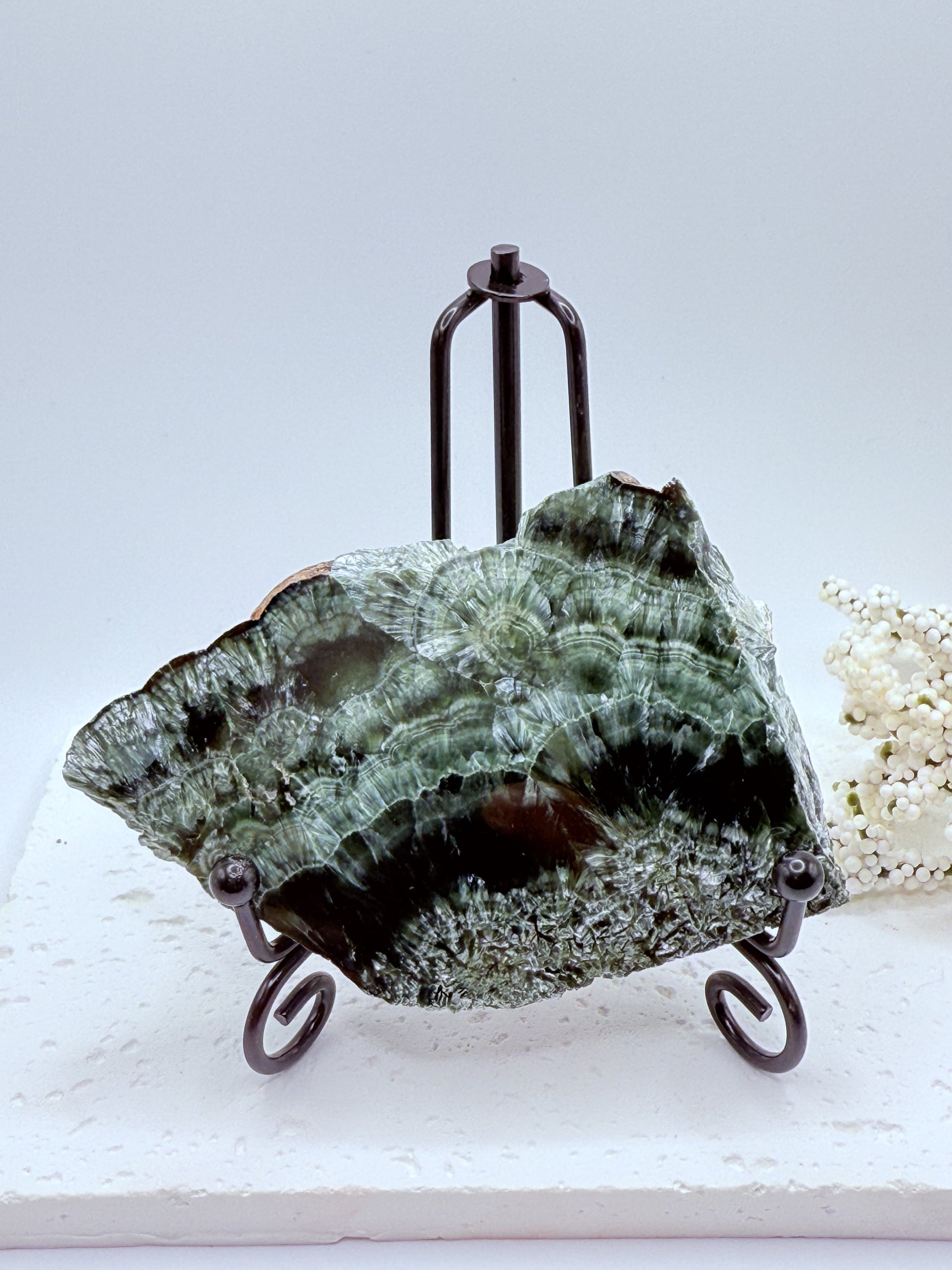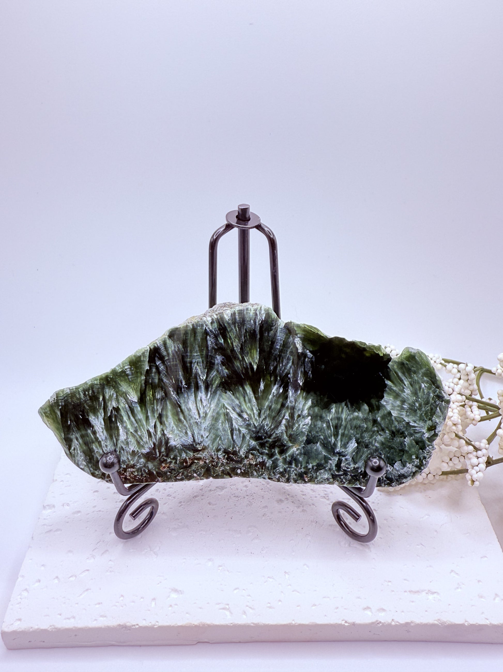 High-Quality Seraphinite Slabs are available in sizes ranging from 8 cm to 12 cm, each displaying deep green tones with feathery, silver chatoyant patterns that resemble angel wings. Seraphinite is known for its strong connection to the heart and higher chakras, promoting deep healing, spiritual enlightenment, and inner harmony. These polished slabs are ideal for meditation, energy work, crystal healing, or decorative display, bringing calming energy, beauty, and a sense of spiritual upliftment to any space.