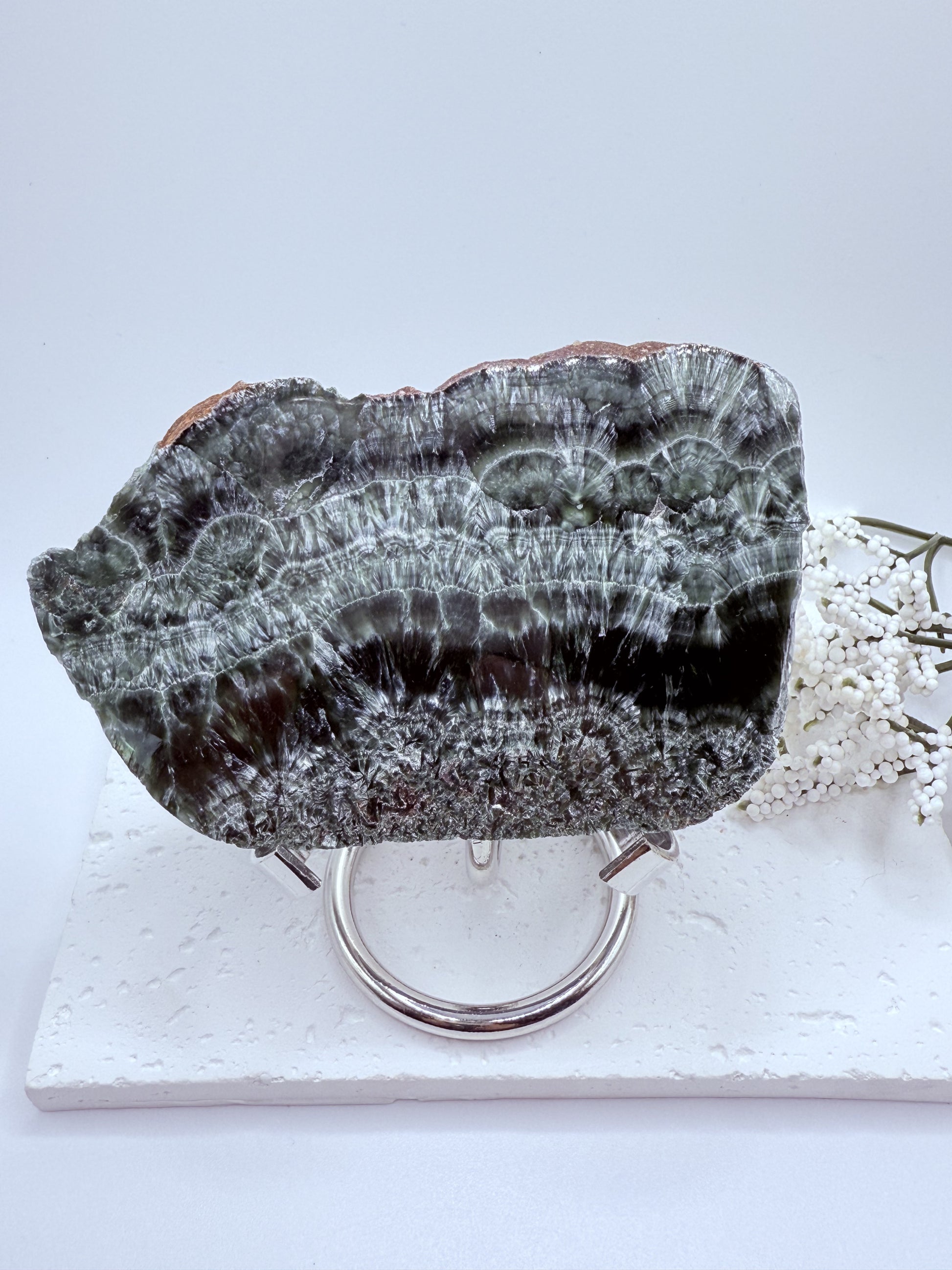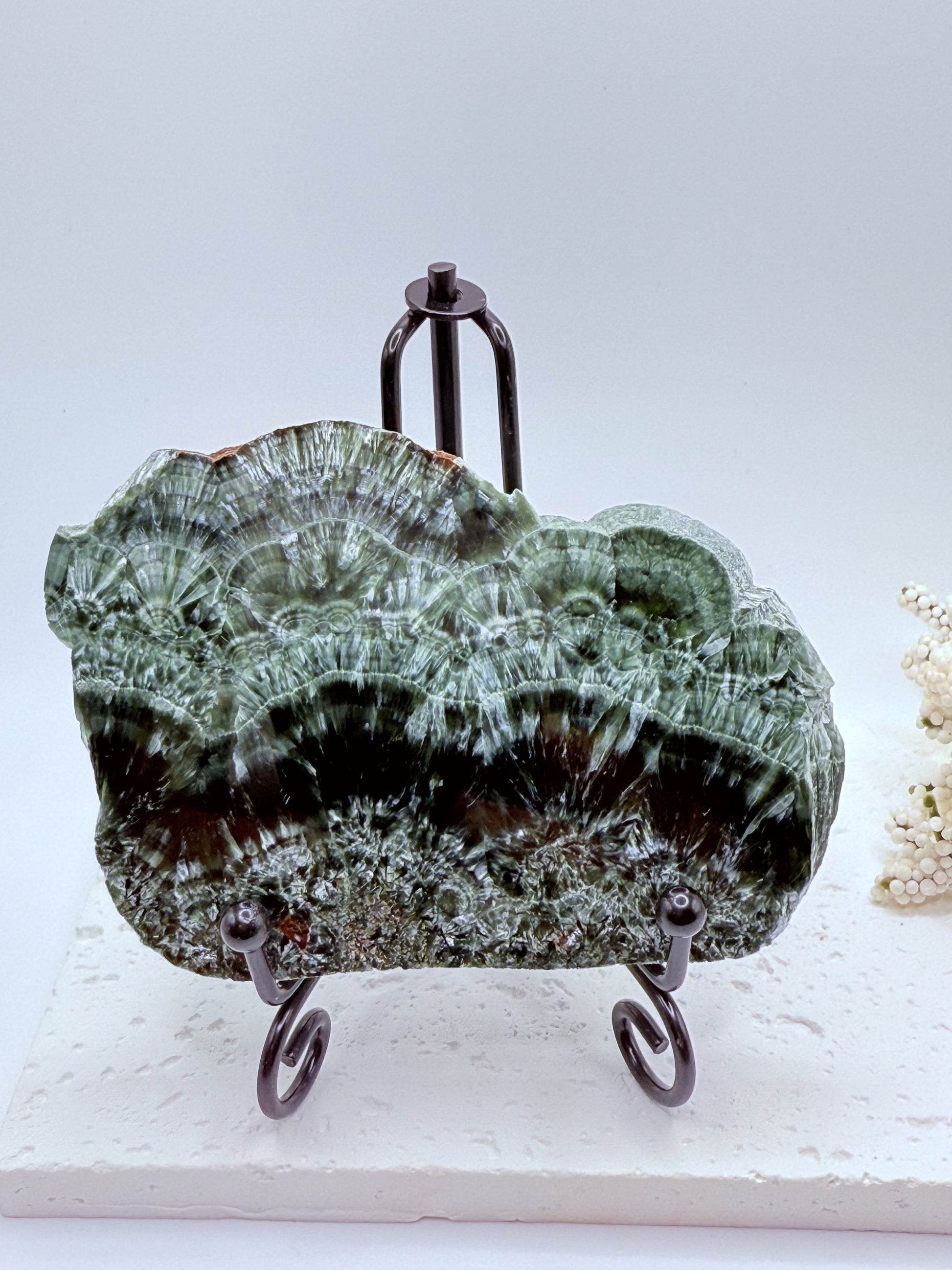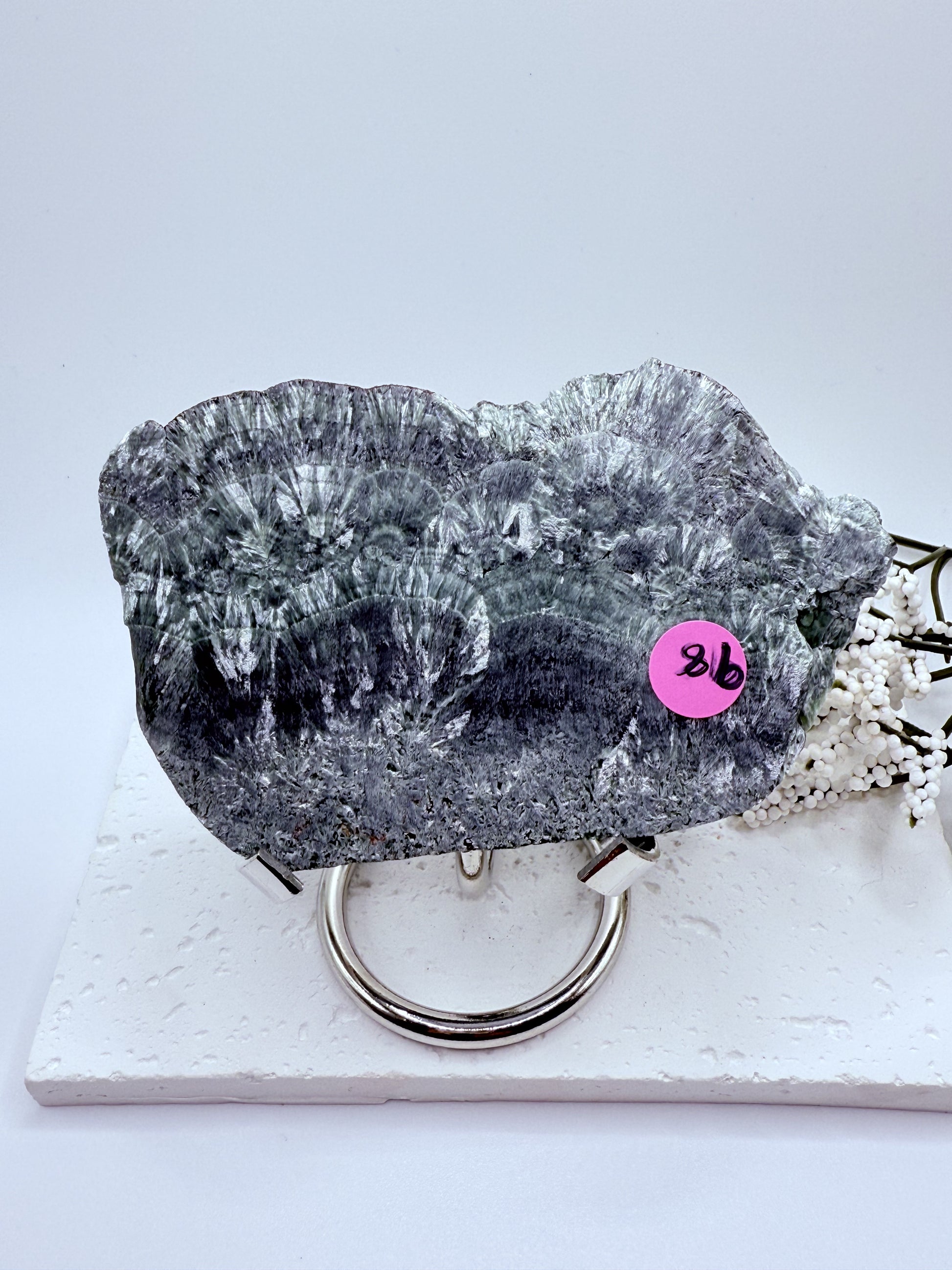 High-Quality Seraphinite Slabs are available in sizes ranging from 8 cm to 12 cm, each displaying deep green tones with feathery, silver chatoyant patterns that resemble angel wings. Seraphinite is known for its strong connection to the heart and higher chakras, promoting deep healing, spiritual enlightenment, and inner harmony. These polished slabs are ideal for meditation, energy work, crystal healing, or decorative display, bringing calming energy, beauty, and a sense of spiritual upliftment to any space.