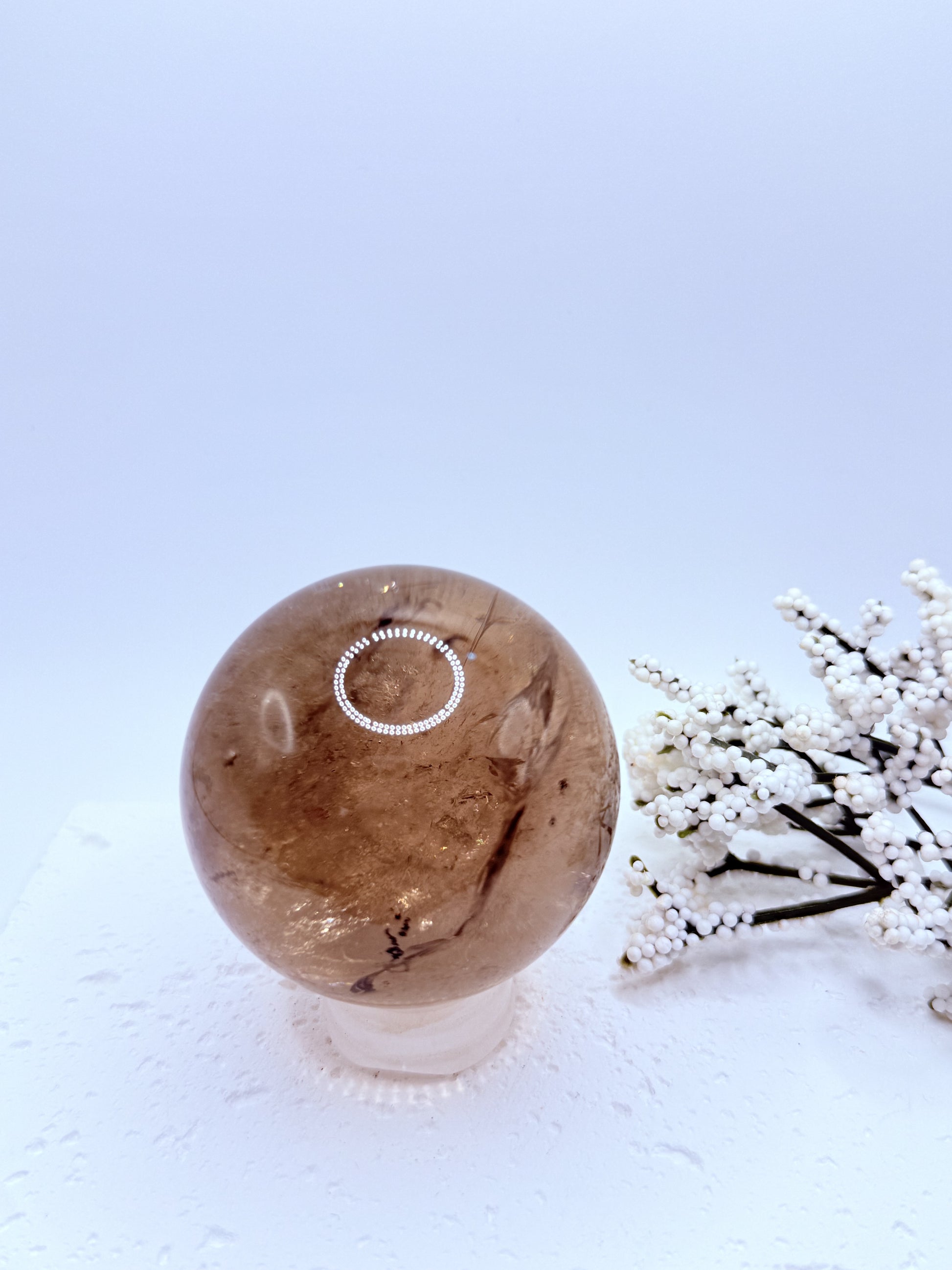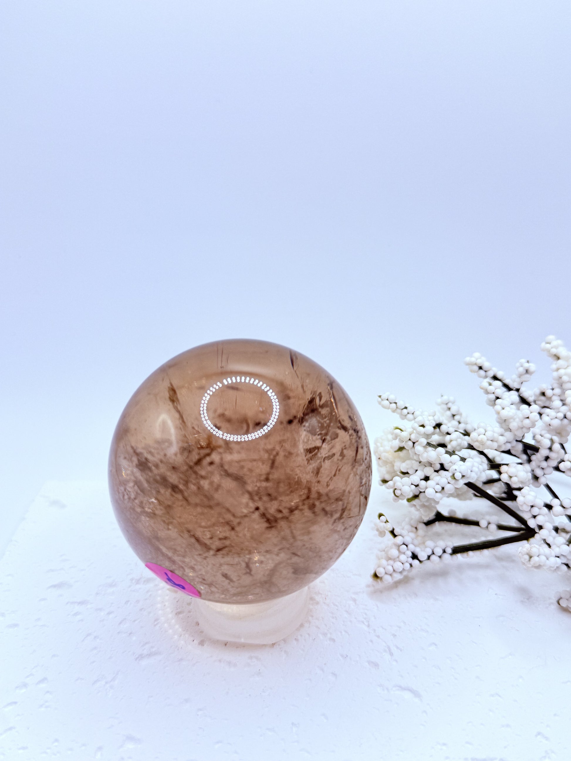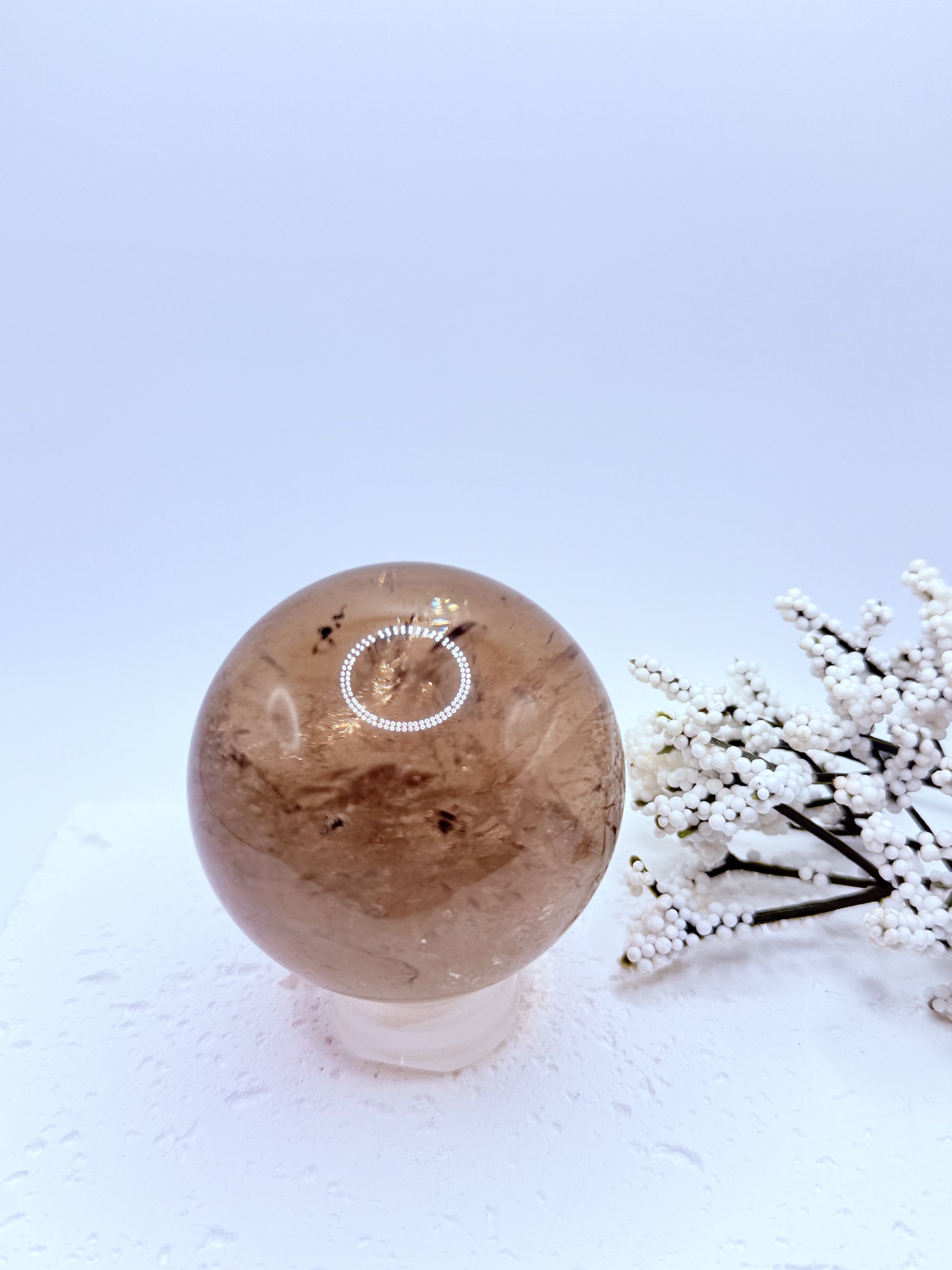 Smoky quartz sphere with clear brown shine. Never find such crystal collections! Its smooth gem adds a neat vibe to my room.