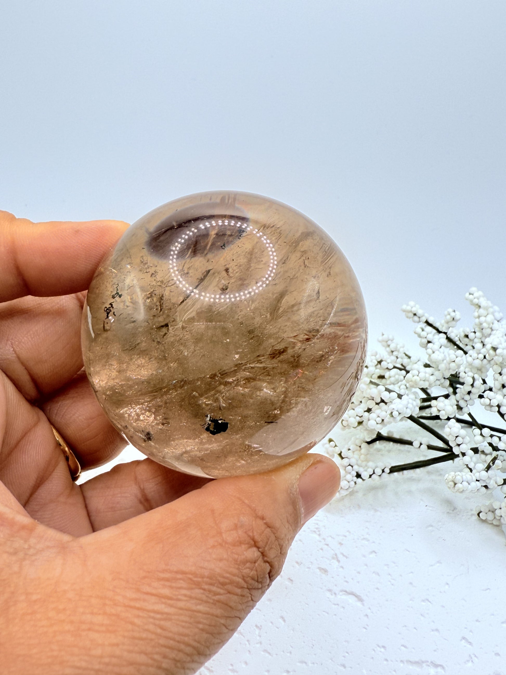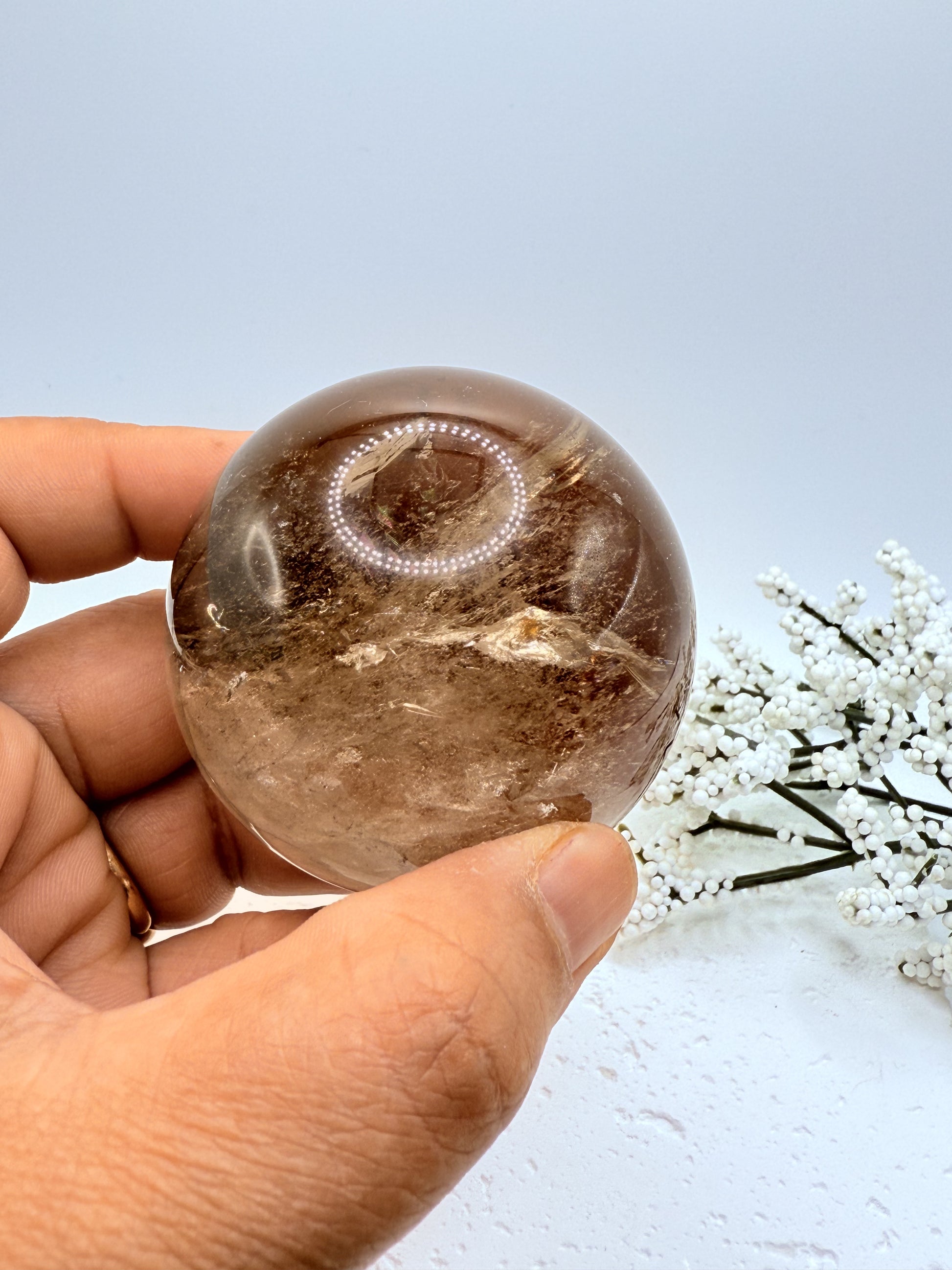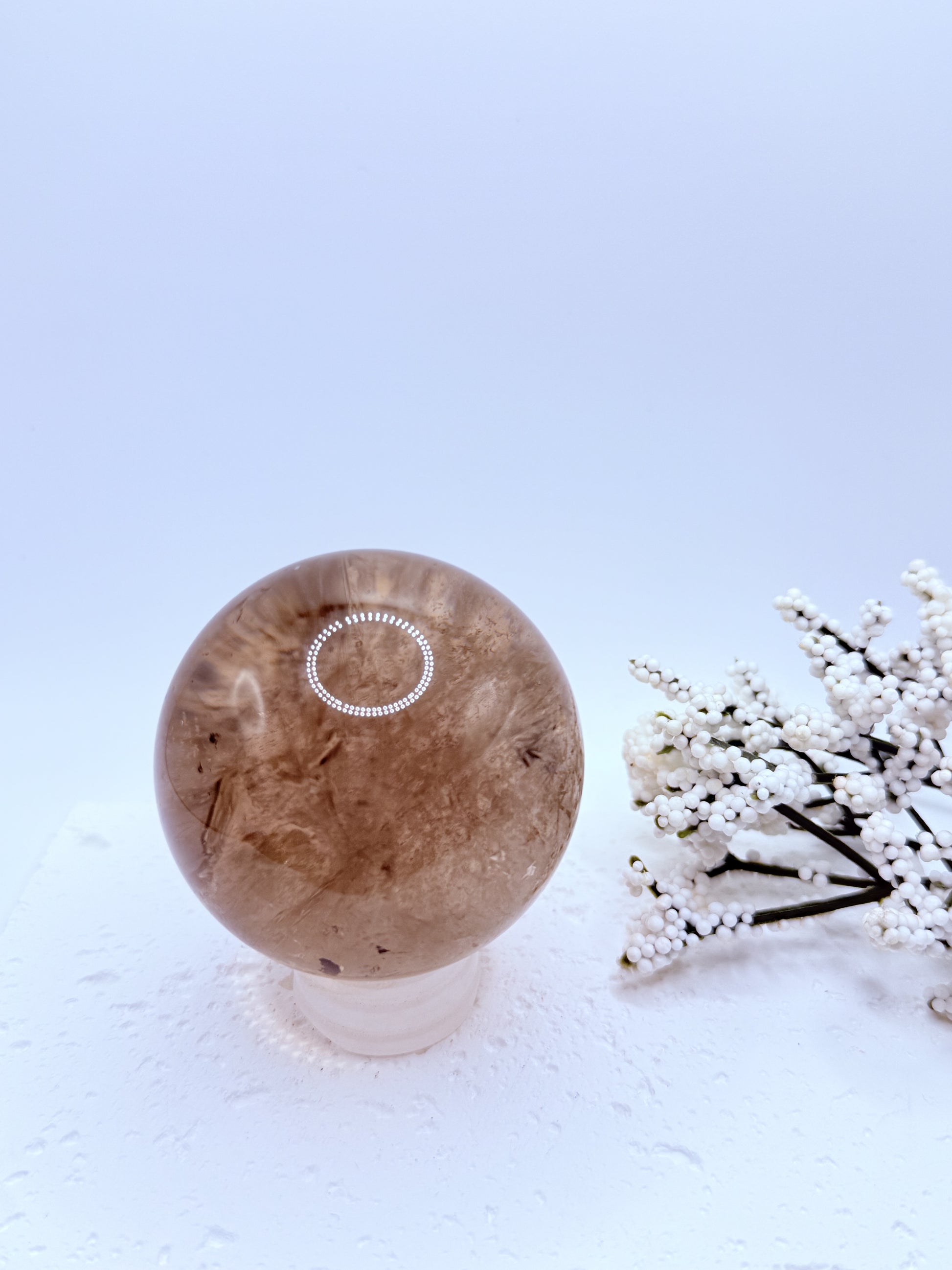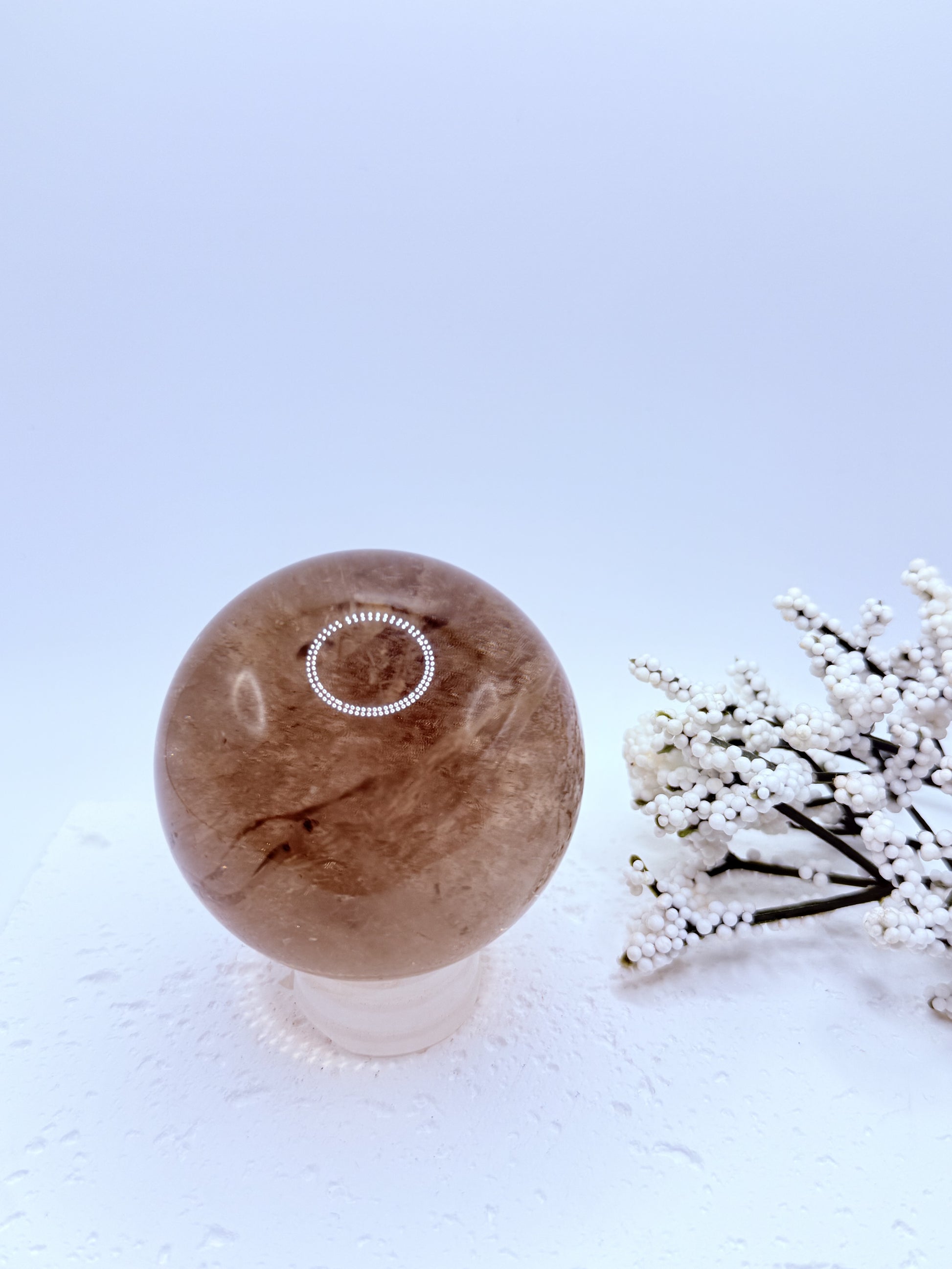 Smoky quartz sphere with clear brown shine. Never find such crystal collections! Its smooth gem adds a neat vibe to my room.