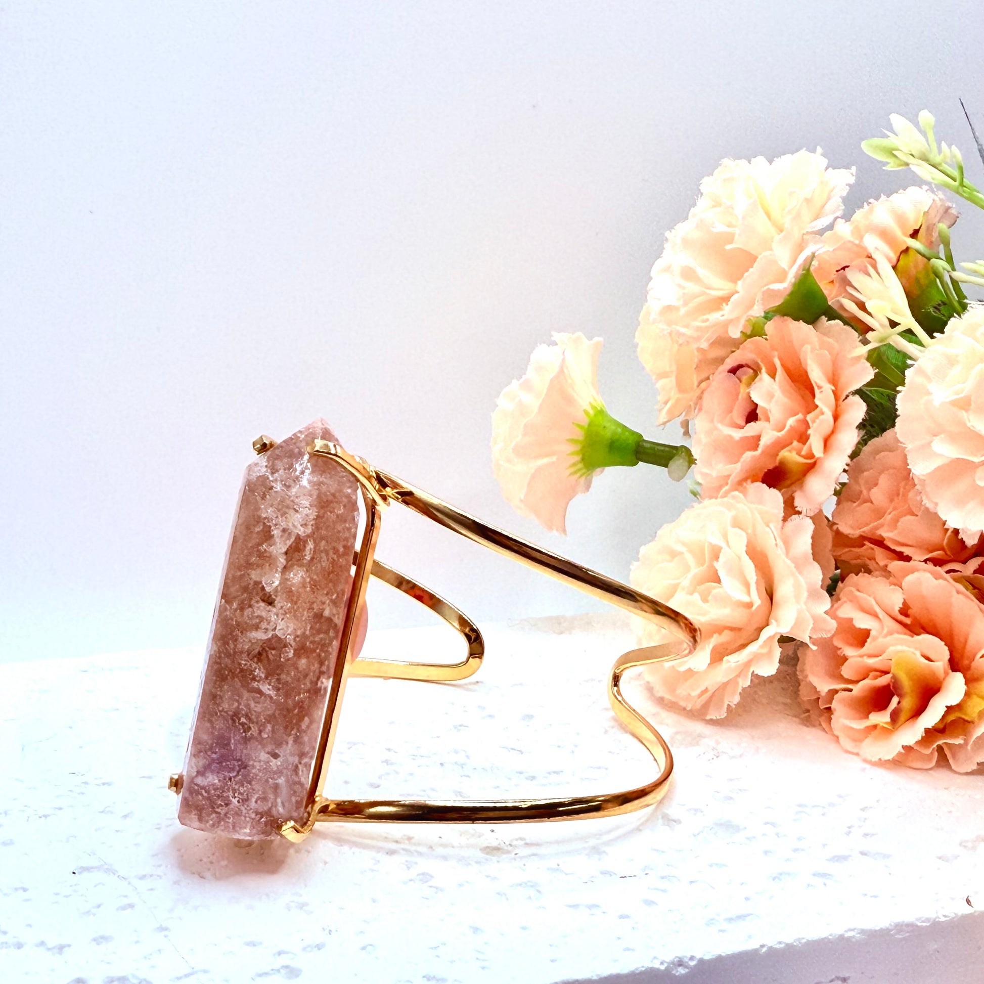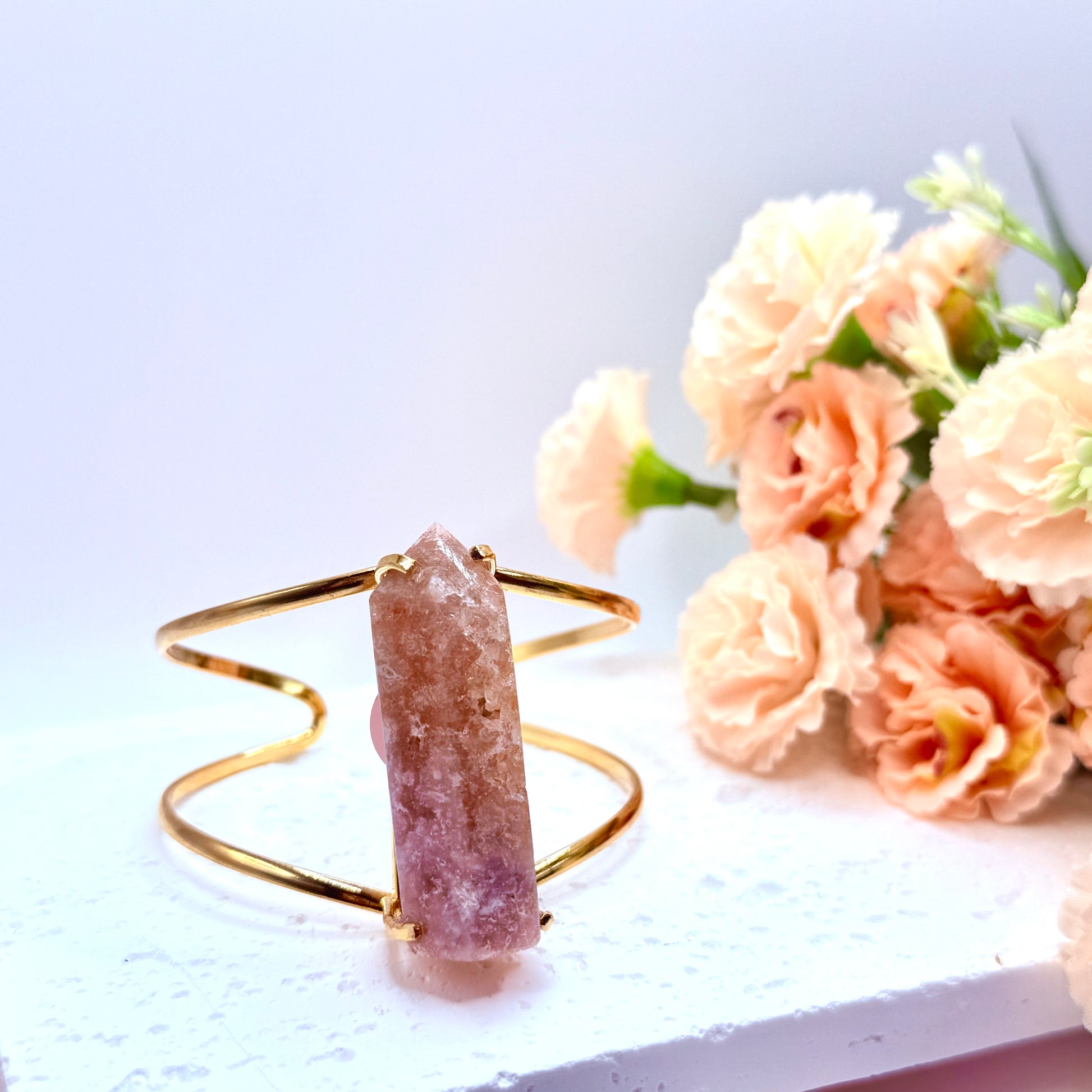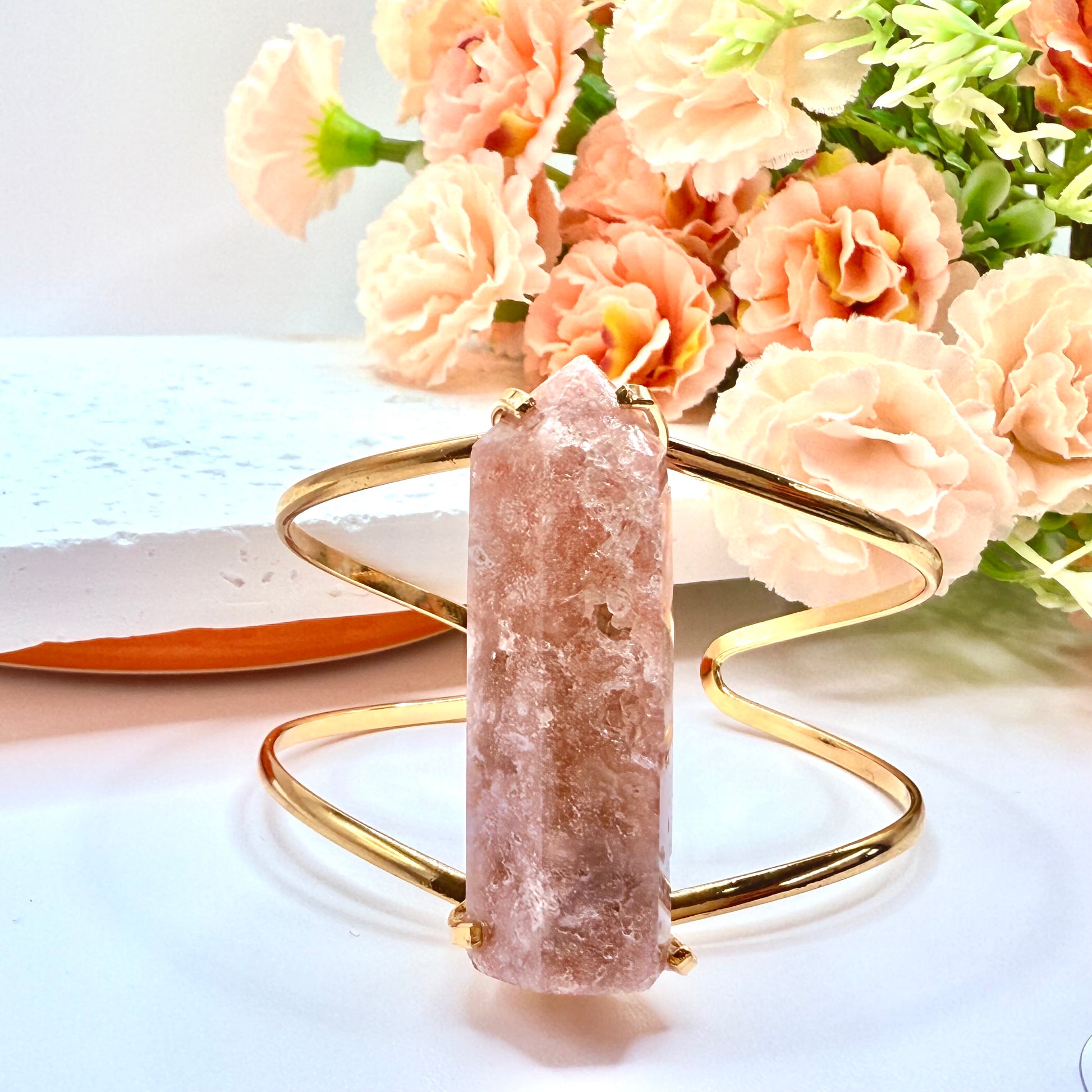 Elegant and powerful, this gold-plated cuff showcases pink amethyst beautifully. It radiates calm, confidence, and feminine energy in every wear.