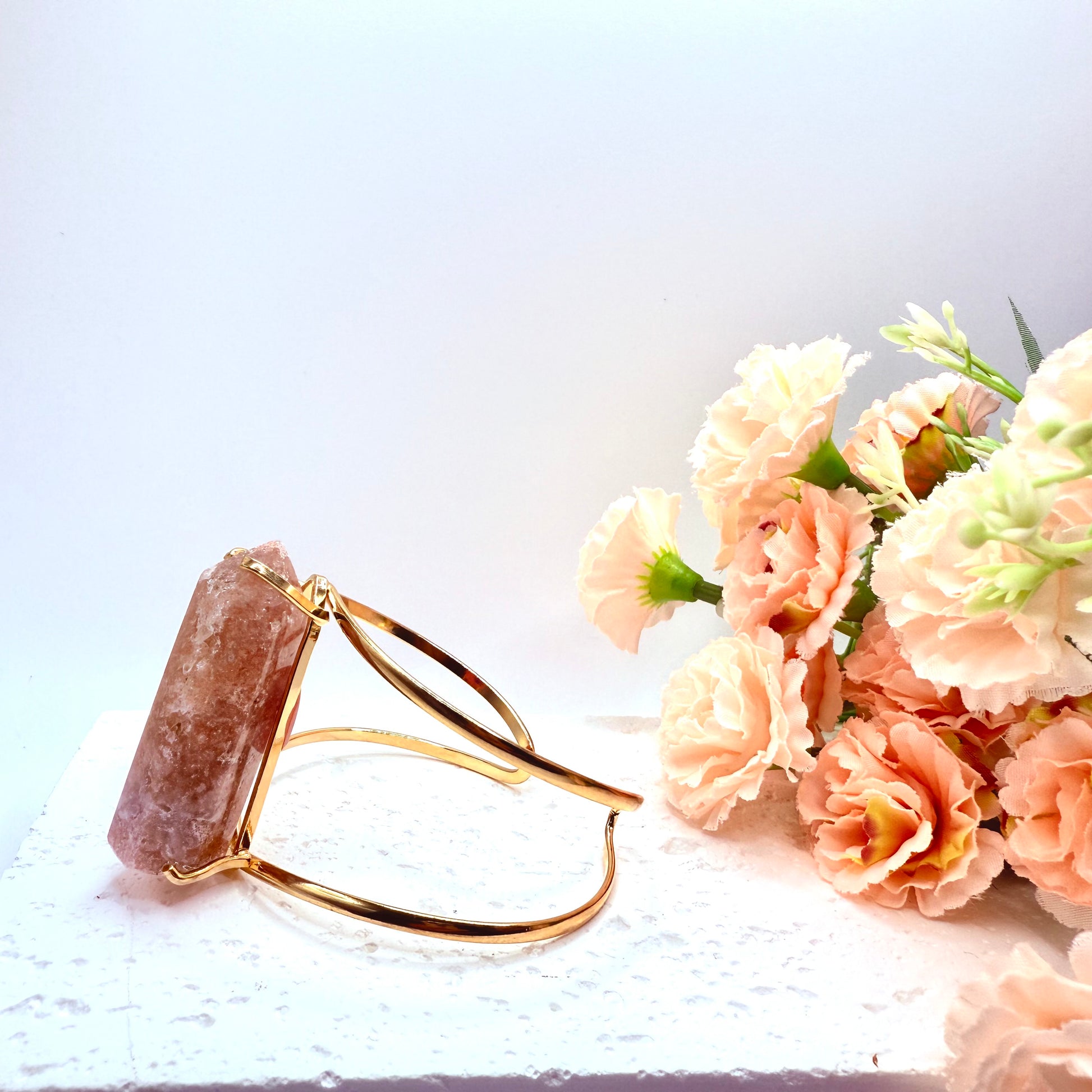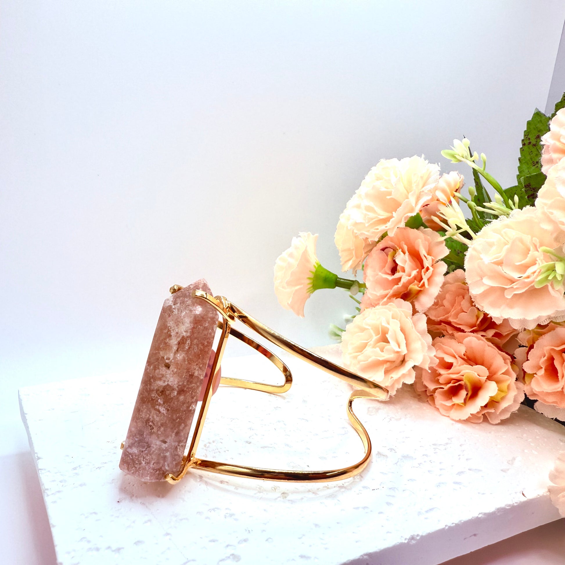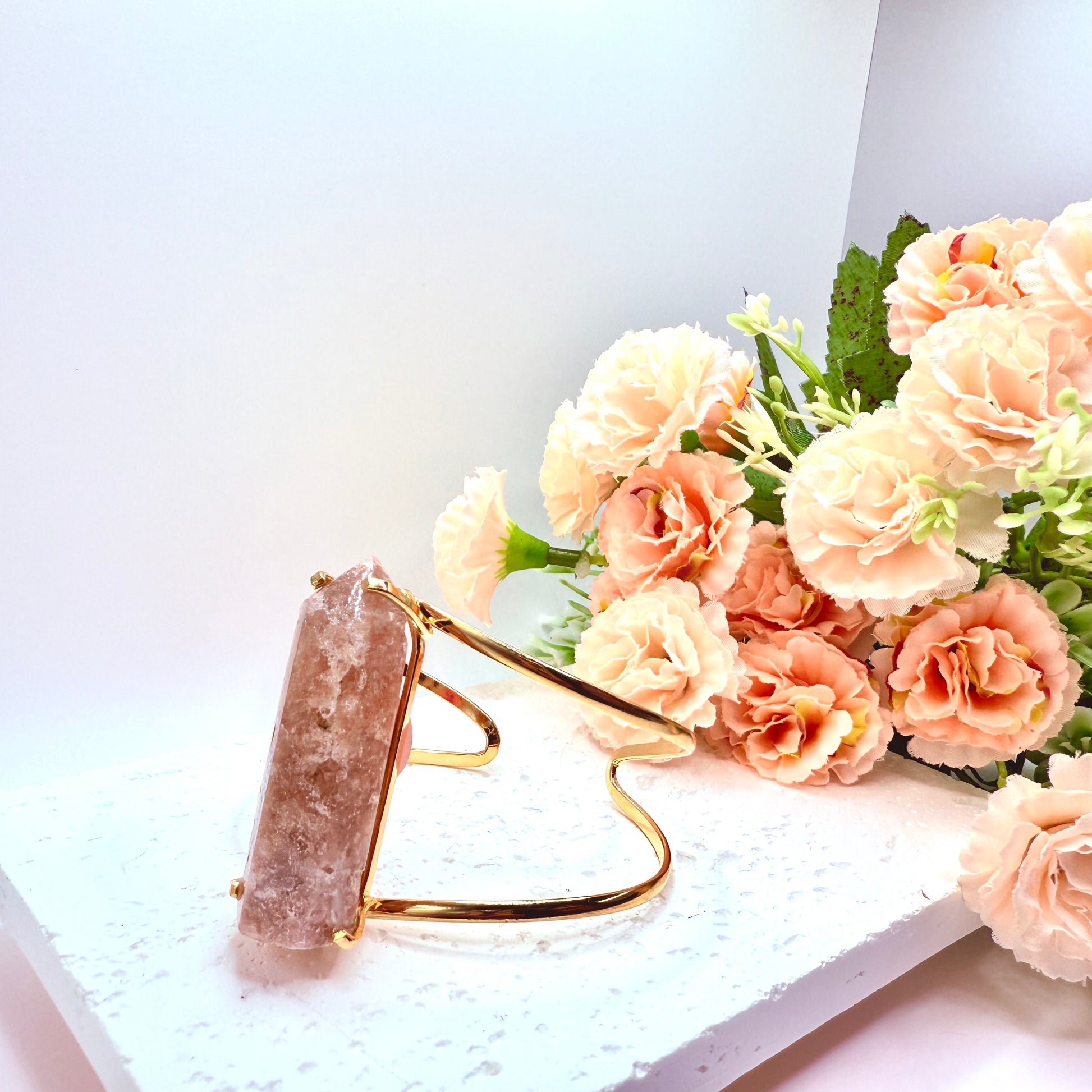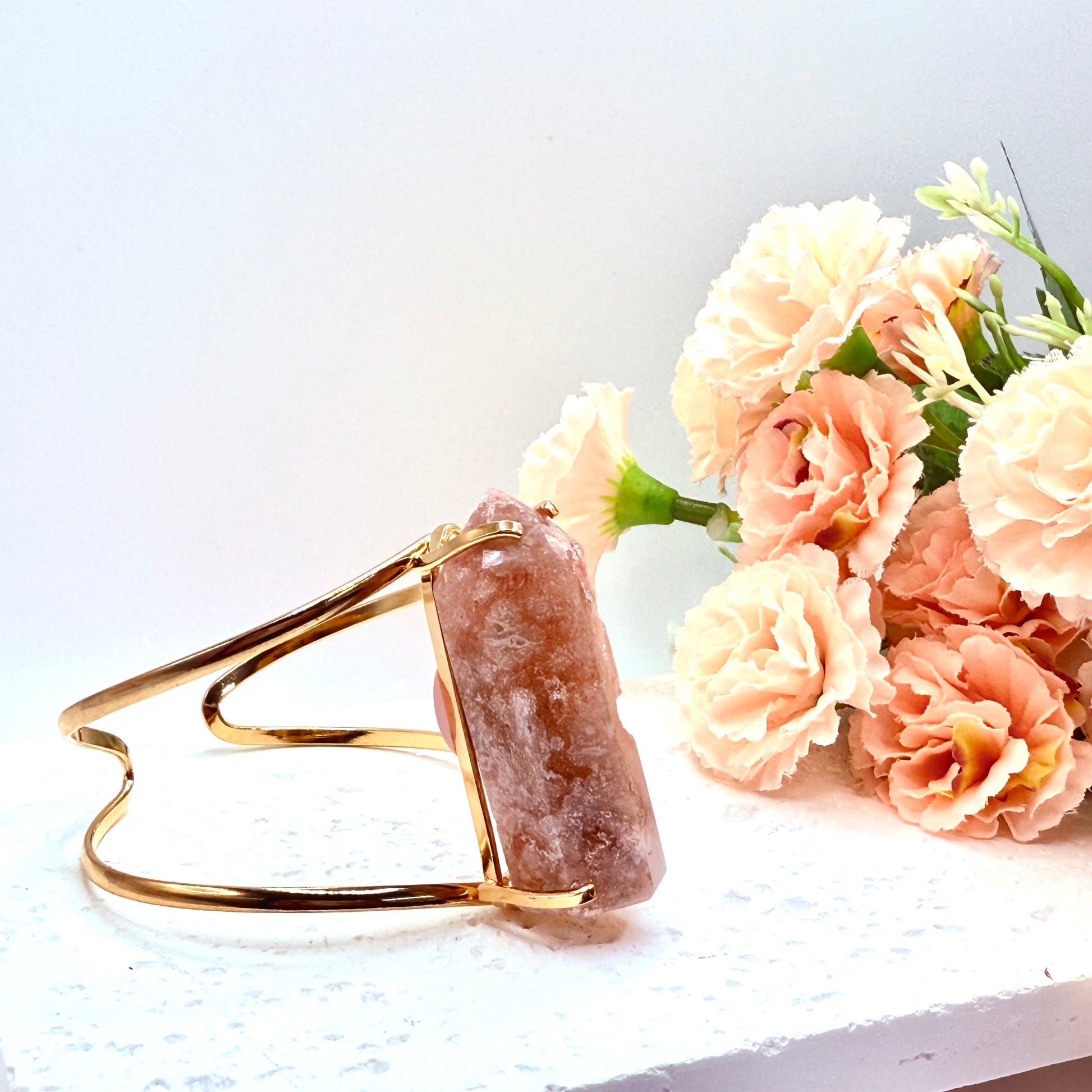 Elegant and powerful, this gold-plated cuff showcases pink amethyst beautifully. It radiates calm, confidence, and feminine energy in every wear.