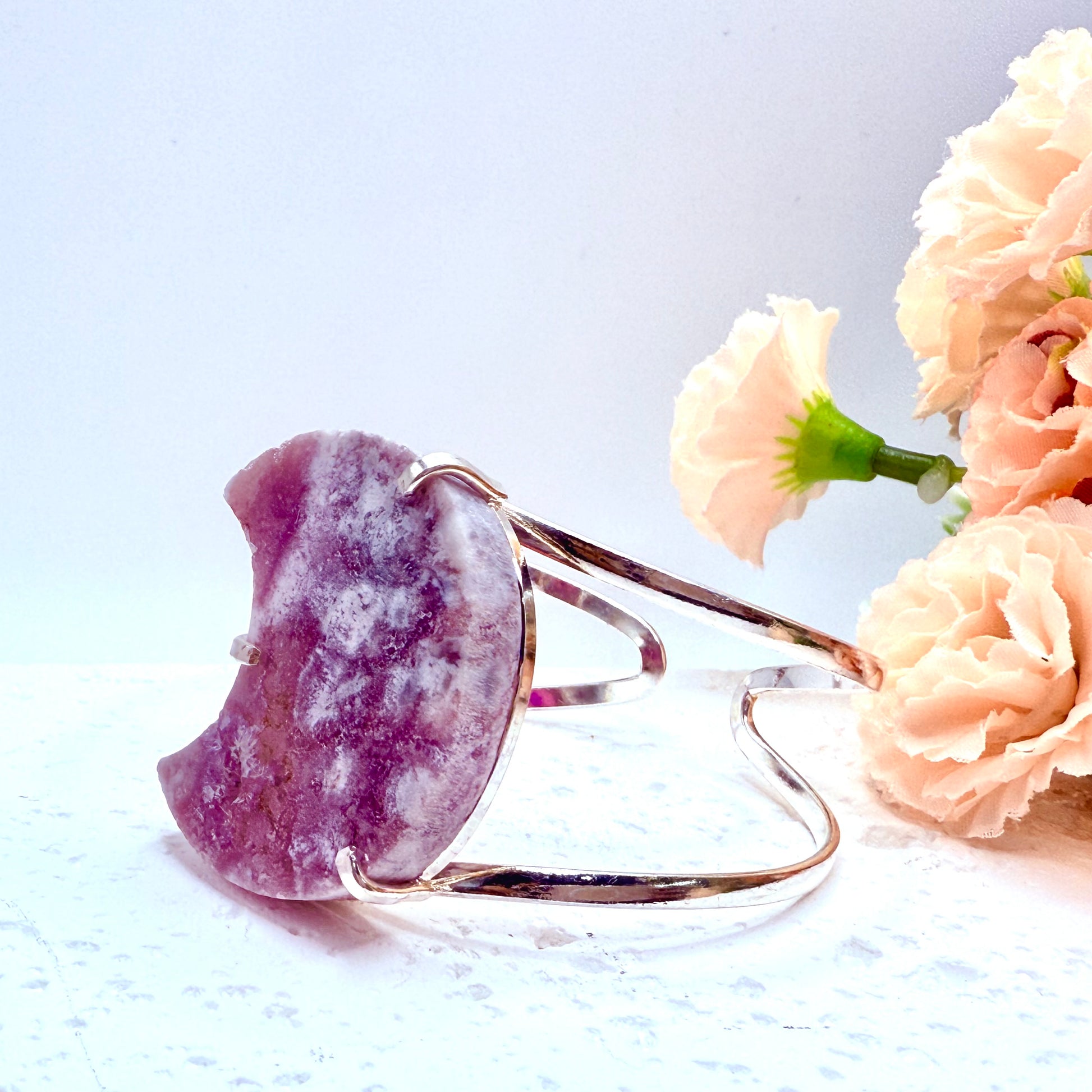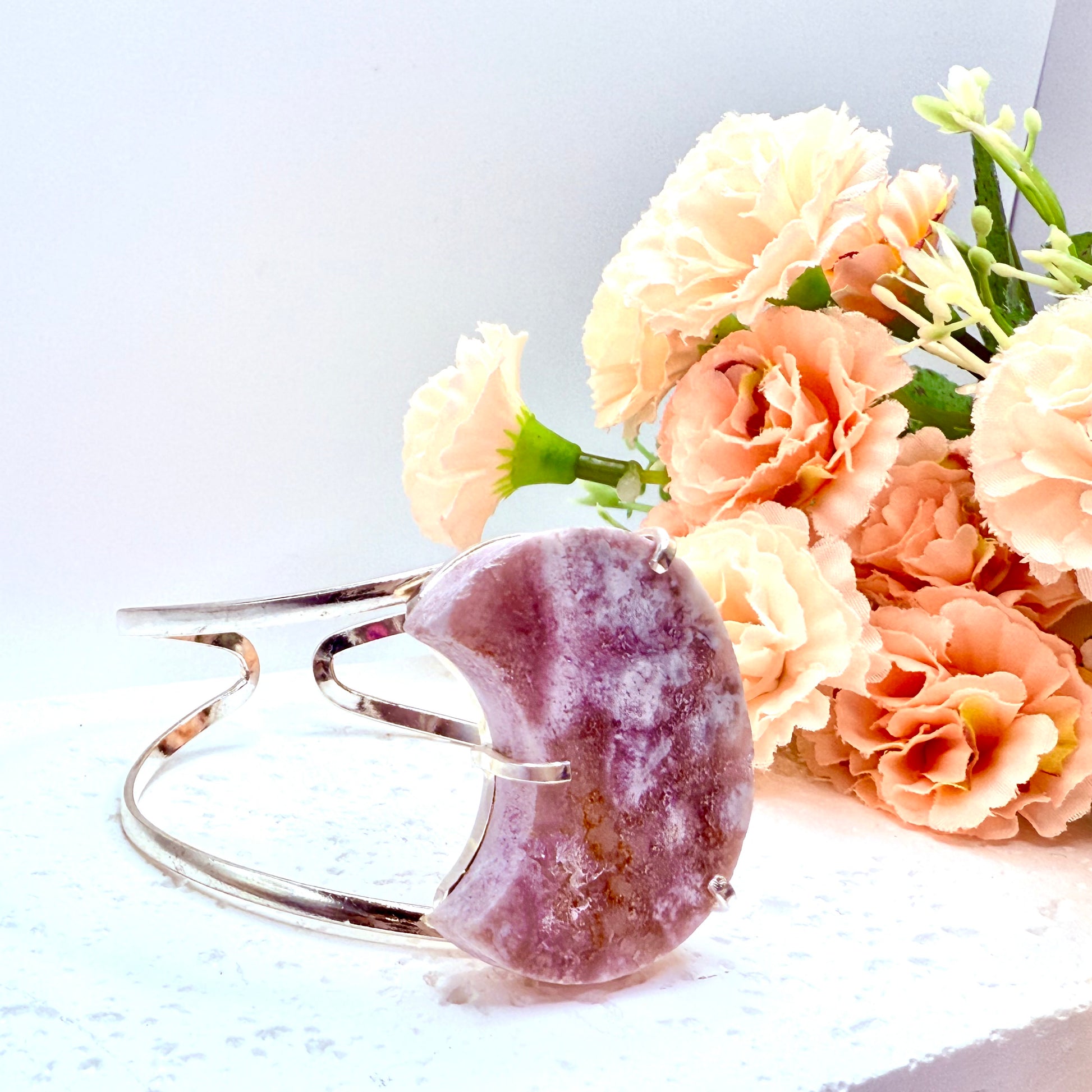 The moon-shaped slice of pink amethyst is dreamy and unique. It brings a calming energy, perfect for emotional healing and moon ritual vibes.