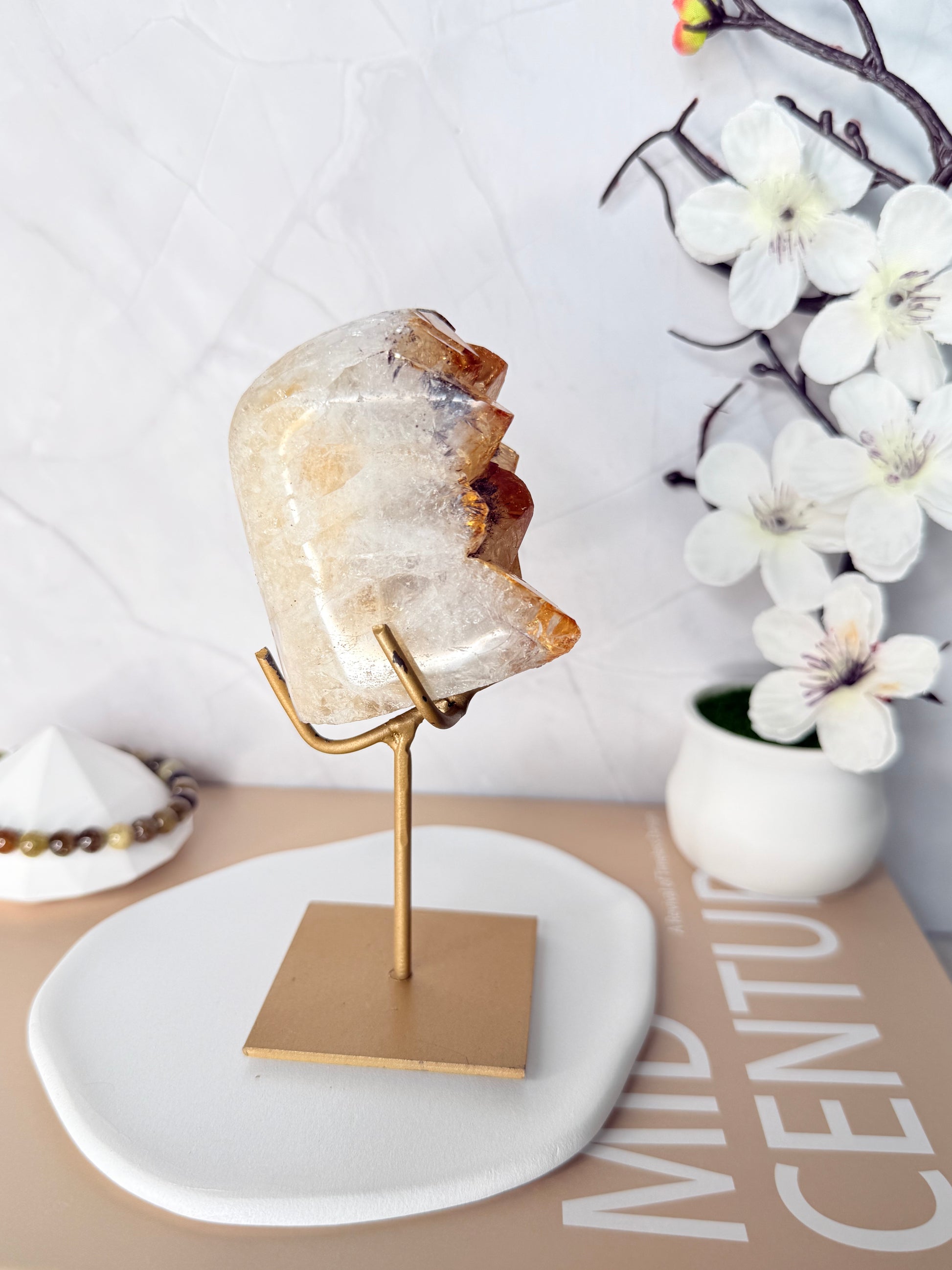 Born from transformation, this Citrine Freeform reveals the radiant evolution of heated amethyst, where deep violet once lived, now glowing in rich golden hues. Its crystalline surface flickers with warm light, while the sculptural form rises effortlessly from its stand, turning raw mineral into a statement of presence.