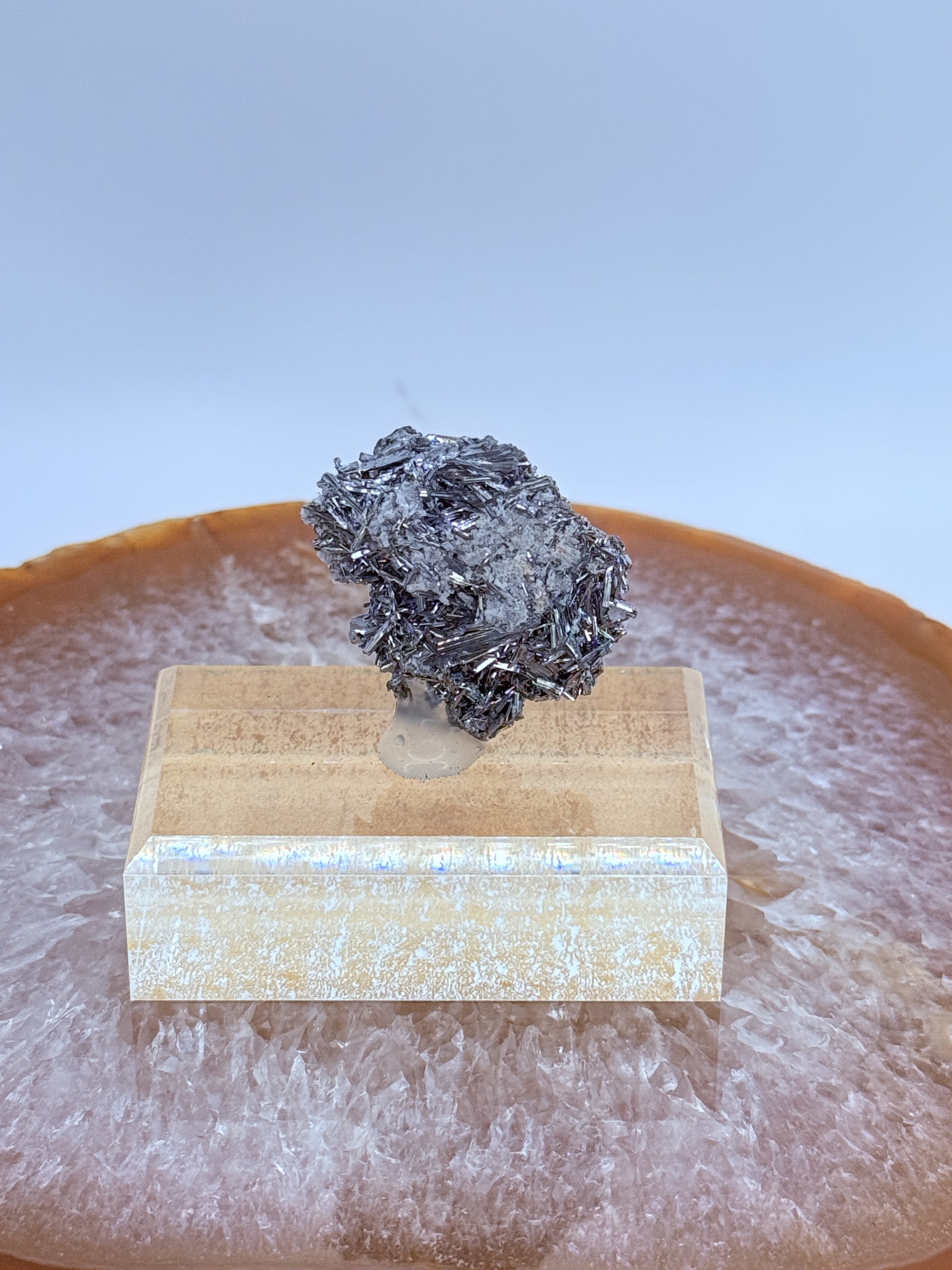 A striking statement of metallic beauty, this Stibnite Specimen features brilliant silver-gray crystal blades that shimmer with natural luster. Known for its bold, reflective appearance and powerful energy, Stibnite is a favorite among collectors and healers alike.